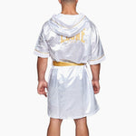 Wejdź na ring z efektami specjalnymi: Szlafrok ringowy Leone Premium jest idealny dla zawodowych bokserów, którzy pragną eleganckiego i potężnego wyglądu. Błyszczący i miękki satyna jest wzbogacony o złote detale. Komfortowy do noszenia, dopełnia strój przed zawodami z nutą wyrafinowania. Dostępny w dwóch wariantach, czarnym i białym, Szlafrok ringowy Leone Premium jest wyposażony w satynowy pasek.